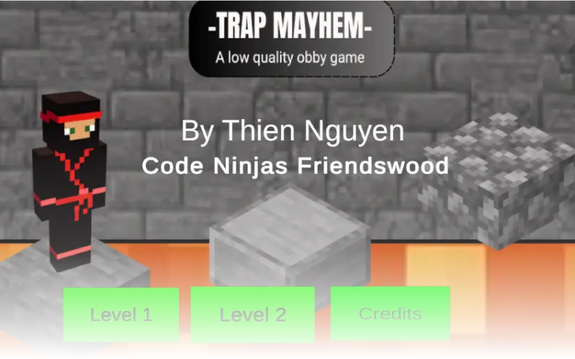 Tom has been going to Code Ninjas Friendswood for 3 years! He loves coding and robotics. Tom’s Black Belt project, Trap Mayhem, is a 3D platformer game filled with tricks and traps! His game is about puzzles and trying to navigate a tricky game!